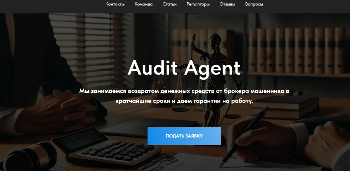 Audit Agent — проект, представленный на сайте auditagent.org, обещает помочь жертвам скамов и инвестиционных мошенников «вернуть деньги». Однако за маской якобы юридической или аудиторской компании скрывается очередная афера, построенная на выманивании дополнительных средств у пострадавших.