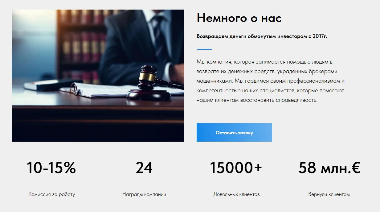 Компания выдает себя за экспертный центр по возврату средств с брокеров, криптобирж и скам-платформ. Сценарий, с которым сталкиваются пользователи, почти всегда одинаков: