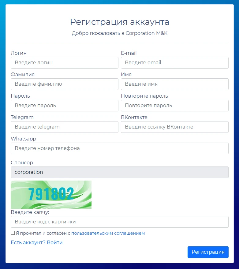 Для создания аккаунта на corporationmk.com требуется: